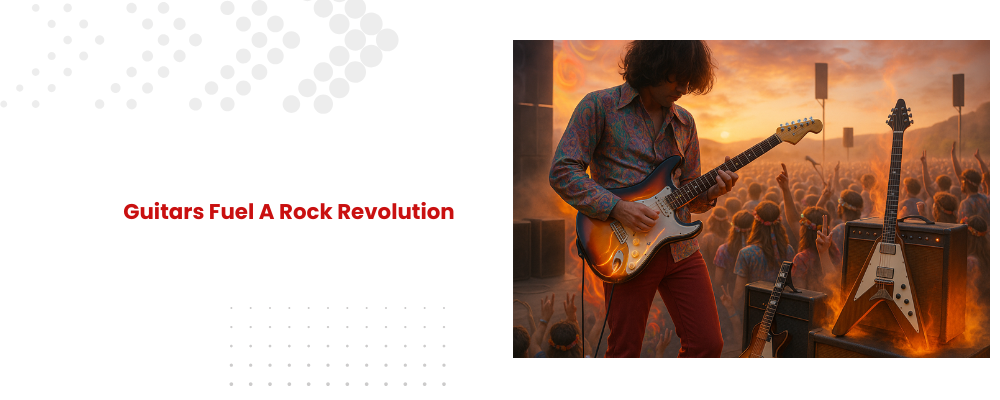 By the 1960s, the electric guitar had become the sound of freedom and youth. Bands like The Beatles brought guitar-driven music to the world, mixing melody with new recording styles. Eric Clapton showed how the instrument could deliver powerful solos and deep blues tones, inspiring countless players. Then came Jimi Hendrix, who transformed the guitar with feedback, distortion, and bold stage presence. His iconic act of setting his Fender Stratocaster on fire at Monterey became a cultural landmark. Bold designs like the Stratocaster and Gibson Flying V gave players new tones and striking looks, fueling rock’s explosive growth.